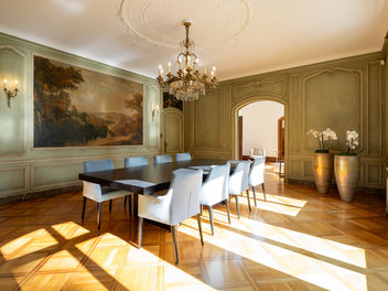 Hohe Decken, historische Details und edle Parkettböden prägen das Erscheinungsbild. Die Raumabfolge schafft Weite und verbindet Repräsentation mit Wohnqualität. Grosszügige Fensterflächen sorgen für natürliche Lichtführung und unterstreichen die offene Atmosphäre.
