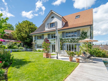 Jeder Raum eröffnet eine neue Perspektive. Lichtdurchflutete Wohnbereiche, fliessende Übergänge zwischen Küche, Essen und Wohnen, grosszügige Fensterfronten mit Blick ins Grüne. Draussen ein gepflegter Garten mit Pool, innen eine klare, zeitlose Gestaltung mit warmen Holzböden und ruhiger Farbgebung.